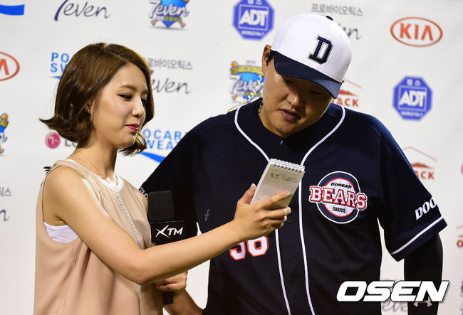 경기후 두산 오재일이 히어로 인터뷰에 앞서 XTM 연상은 아나운서의 질문 내용을 살피고 있다./ jpnews@osen.co.kr
