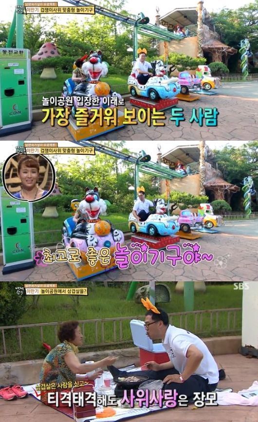 또한 장모는 이만기에게 "힘도 없고 배가 고프다. 여기 앉아 고기 구워 먹자"며 놀이공원 취사를 제안했다. 이에 이만기는 누가 놀이공원에서 고기를 구워먹냐"며 당황했지만, 이내 장모와 함께 정답게 불을 피워 고기를 구웠다.