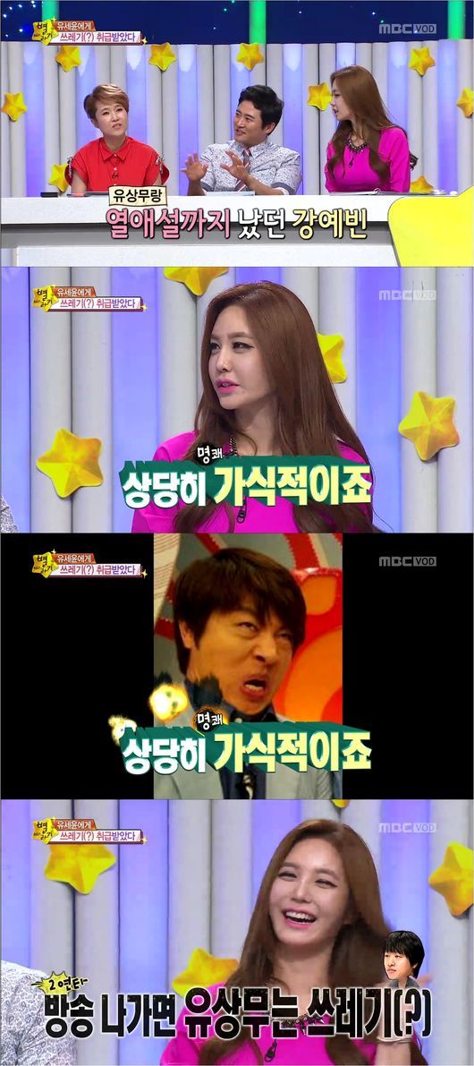 강예빈은 지난 10일 방송된 MBC 예능프로그램 ‘별바라기’에서 임호가 “강예빈 씨는 유상무 씨와 열애설이 나지 않았느냐?”고 묻자 “상당히 가식적이다”라고 일침을 가했다.