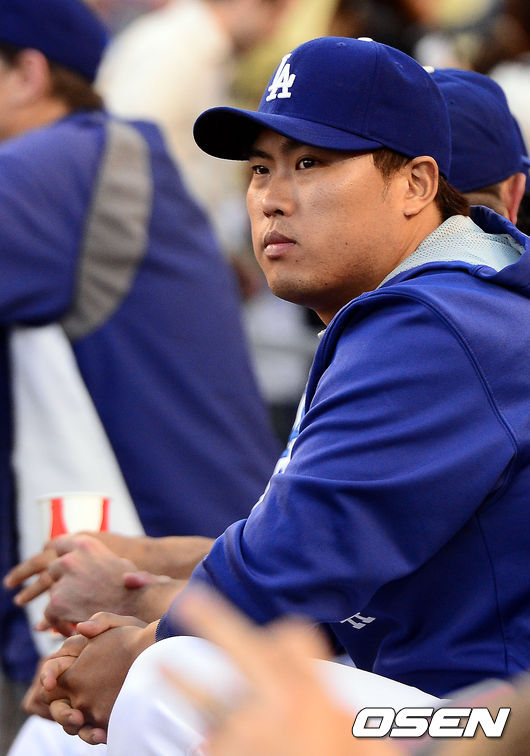 다저스 류현진이 더그아웃에 앉아 경기를 관전하고 있다.
