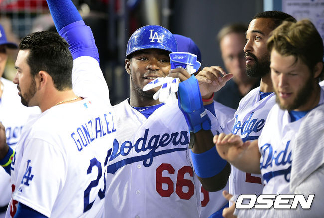4회말 2사 3루 다저스 푸이그가 밴 슬라이크가 적시타로 득점을 올린 뒤 기뻐하고 있다.