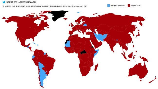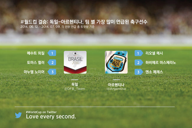 트위터는 오는 14일 열리는 2014 브라질월드컵 독일-아르헨티나 결승전을 앞두고, 6월 12일부터 7월 9일까지 전 세계 국가 대상 독일(#GER), 아르헨티나(#ARG) 트위터 해시태그 총량을 조사했다. 그 결과, 독일이 796만 3767건, 아르헨티나 780만 5598건으로 독일이 약 16만건 높은 것으로 나타났다. 한국 내에서도 독일, 아르헨티나 해시태그 점유율은 각각 58%, 42%를 나타내며 독일이 앞섰다.