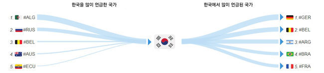 또한, 지난 6월 12일부터 7월 6일까지 한국에서 가장 많이 언급된 국가 해시태그는 1위 독일(#GER, 8.7%), 2위 벨기에(#BEL, 7.5%), 3위 아르헨티나(#ARG, 7.1%)로 나타났으며 브라질(#BRA, 5.9%)과 프랑스(#FRA, 5.9%)가 뒤를 이었다. 한편 한국을 가장 많이 언급한 국가는 1위 알제리(#ALG, 13.3%), 2위 러시아(#RUS, 9.7%), 3위 벨기에(#BEL, 5.2%)로 대한민국 국가대표팀과 경기를 했던 상대팀 국가들이 상위권을 기록했다.