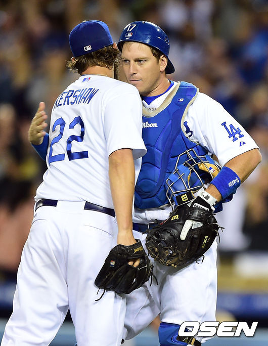 완투승을 거둔 다저스 커쇼가 A.J 엘리스와 포옹을 하고 있다./youngrae@osen.co.kr