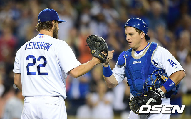 완투승을 거둔 다저스 커쇼가 A.J 엘리스와 기뻐하고 있다./youngrae@osen.co.kr