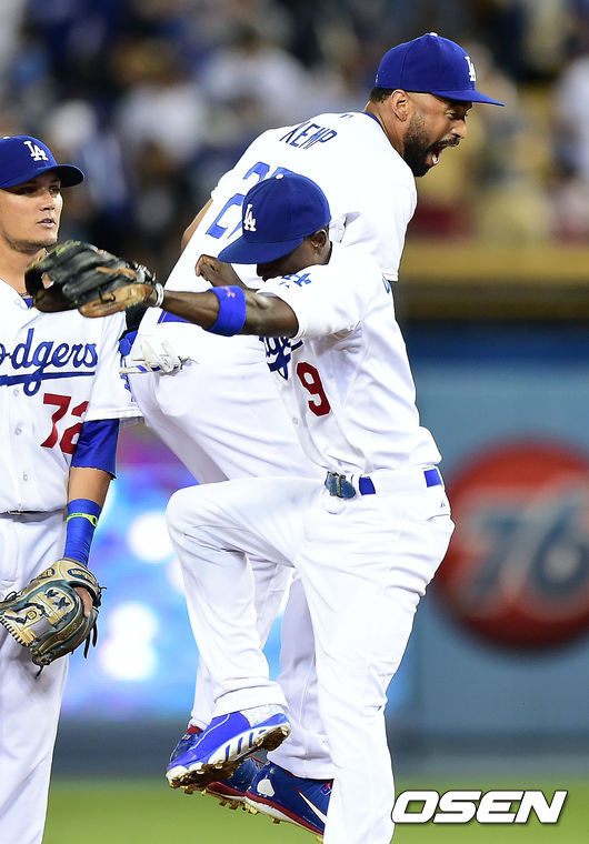 승리를 거둔 다저스 켐프와 고든이 세레머니를 하고 있다./youngrae@osen.co.kr