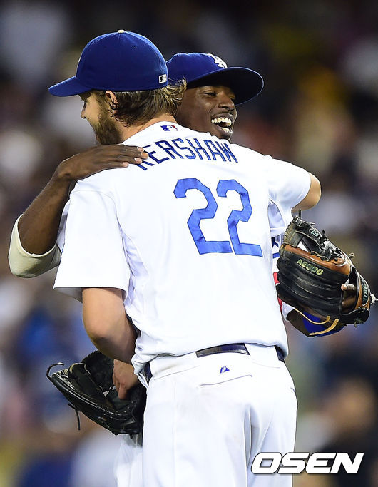 완투승을 거둔 다저스 커쇼와 디 고든이 포옹을 하고 있다./youngrae@osen.co.kr
