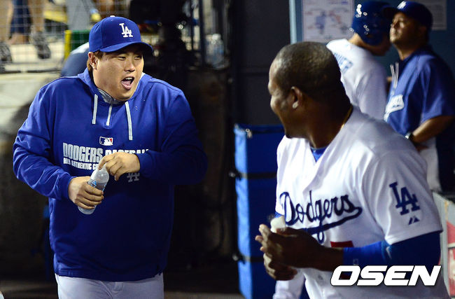 다저스 류현진과 유리베가 장난을 치고 있다./youngrae@osen.co.kr