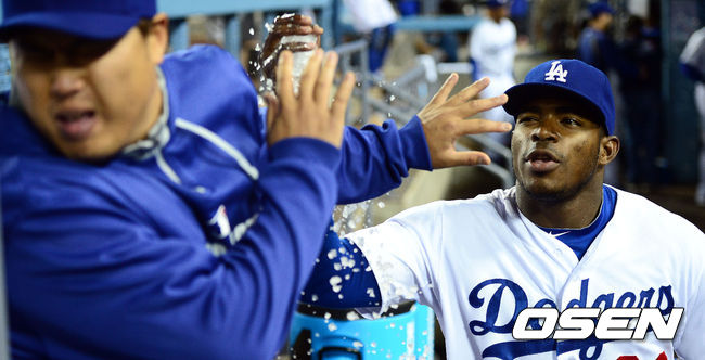 다저스 푸이그가 류현진에게 장난을 치고 있다./youngrae@osen.co.kr