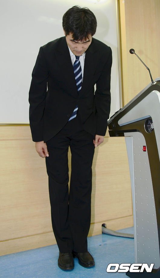 정재근 감독이 허리를 숙여 인사하고 있다.