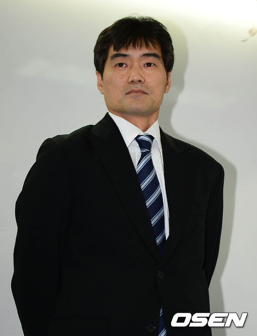 정재근 감독이 기자회견장으로 들어와 포토타임을 갖고 있다.