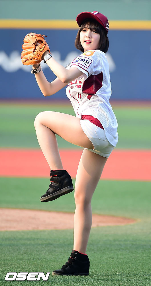 11일 오후 서울 목동야구장에서 열린 '2014 한국야쿠르트 세븐 프로야구' 넥센 히어로즈와 NC 다이노스의 경기에서, 걸그룹 '단발머리'의 유정이 시구를 하고 있다.
