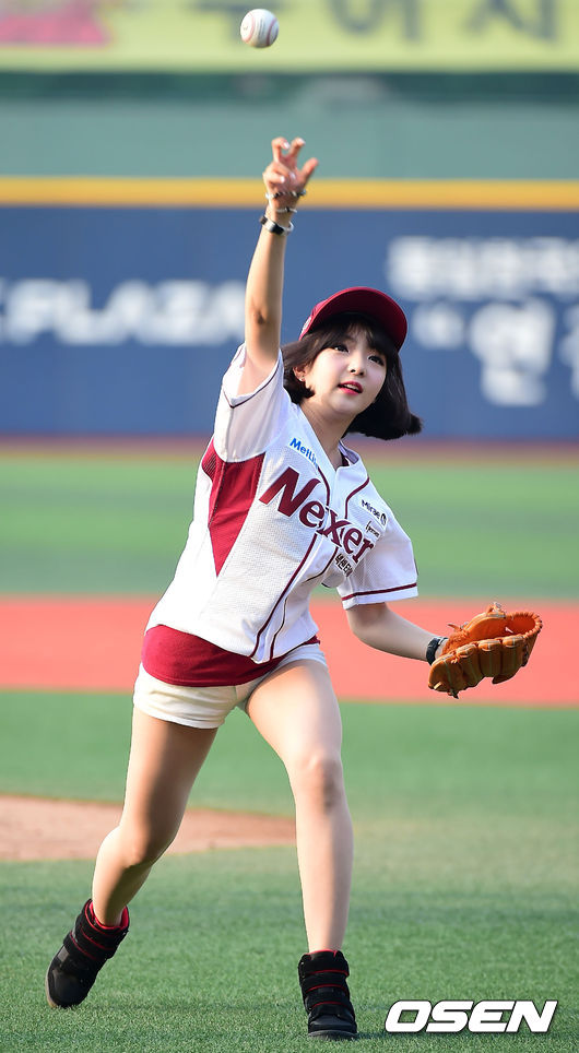 11일 오후 서울 목동야구장에서 열린 '2014 한국야쿠르트 세븐 프로야구' 넥센 히어로즈와 NC 다이노스의 경기에서, 걸그룹 '단발머리'의 유정이 시구를 하고 있다.