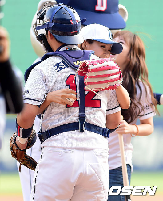 시구-시타자로 나선 그룹 립서비스 비파가 시구를 마치고 포수 최재훈을 끌어안고 있다.