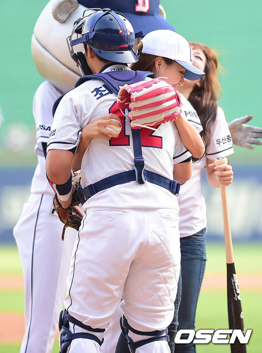 시구-시타자로 나선 그룹 립서비스 비파와 코라가 포수 최재훈을 끌어안고 있다.