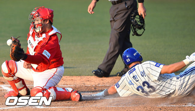 11일 오후 대구구장에서 열린 2014 한국야쿠르트 세븐 프로야구 삼성 라이온스와 SK 와이번스의 경기, 1회말 1사 1루 삼성 채태인의 선취 1타점 2루타때 1루 주자 박한이가 선취득점을 올리고 있다.