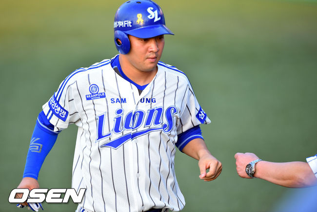 11일 오후 대구구장에서 열린 2014 한국야쿠르트 세븐 프로야구 삼성 라이온스와 SK 와이번스의 경기, 1회말 1사 1루 삼성 이승엽의 1타점 적시타때 홈을 밟은 3루 주자 채태인이 류중일 감독과 하이파이브를 하고 있다. 채태인은 이번 타석에서 선취 1타점 적시타를 기록했다.