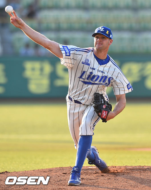 11일 오후 대구구장에서 열린 2014 한국야쿠르트 세븐 프로야구 삼성 라이온스와 SK 와이번스의 경기, 1회초 삼성 선발투수 밴덴헐크가 역투하고 있다