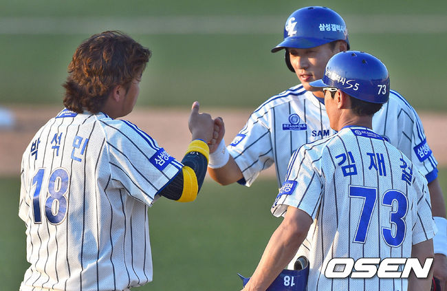 11일 오후 대구구장에서 열린 2014 한국야쿠르트 세븐 프로야구 삼성 라이온스와 SK 와이번스의 경기, 1회말 이닝종료 후 삼성 박석민이 이승엽 향해 엄지손가락을 보이고 있다. 이승엽은 전 타석에서 1타점 적시타를 기록했다.