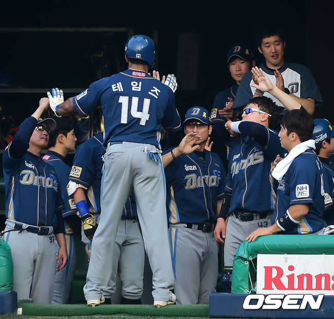 11일 오후 서울 목동야구장에서 열린 '2014 한국야쿠르트 세븐 프로야구' 넥센 히어로즈와 NC 다이노스의 경기에서, 2회초 1사 주자 만루 NC 권희동의 중견수 희생플라이때 홈을 밟은 테임즈가 덕아웃에서 동료들과 하이파이브를 하고 있다.