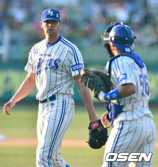 11일 오후 대구구장에서 열린 2014 한국야쿠르트 세븐 프로야구 삼성 라이온스와 SK 와이번스의 경기, 1회초 무실점으로 SK 타선을 막은 삼성 선발투수 밴덴헐크가 이지영 포수와 이야기를 나누며 더그아웃으로 들어가고 있다