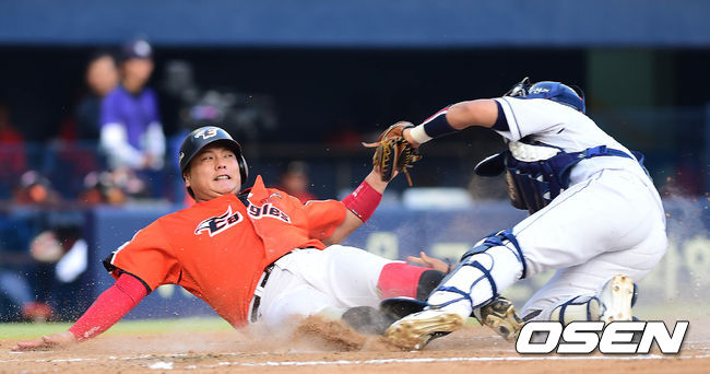 2회초 한화 공격 무사 2, 3루 상황 고동진의 내야 땅볼 때 홈으로 내달린 3루주자 김태균이 홈에서 두산 포수 최재훈의 태그에 걸려 아웃되고 있다.