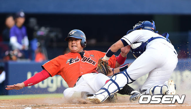 2회초 한화 공격 무사 2, 3루 상황 고동진의 내야 땅볼 때 홈으로 내달린 3루주자 김태균이 홈에서 두산 포수 최재훈의 태그에 걸려 아웃되고 있다.