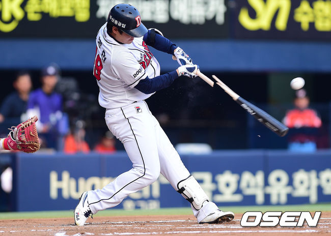 1회말 두산 공격 1사 주자없는 상황 민병헌이 내야 땅볼을 날릴 때 배트가 부러지고 있다.