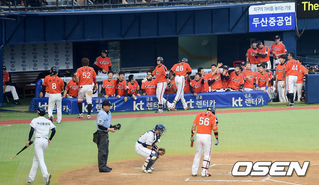 3회초 한화 공격 2사 1, 2루 상황 피에가 우월 스리런포를 날리고 더그아웃 동료들과 인사를 나누고 있다.