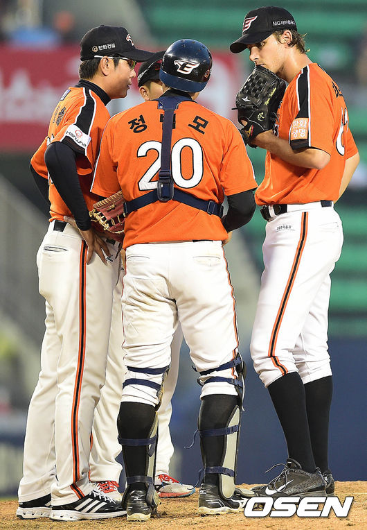 4회말 두산 공격 무사 만루 상황 한화 선발 타투스코가 정민철 코치와 대화를 나누고 있다.