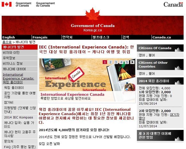 주한 캐나다 대사관은 11일 오전 7시(7월 10일, 오후 6시 캐나다, 오타와 시간) 부터 2014년 2차 IEC(International Experience Canada), 캐나다 워킹홀리데이 신청을 접수중이다.