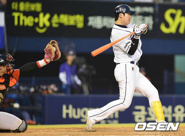 4회말 두산 공격 무사 만루 상황 이원석이 한화 선발 타투스코의 높은 공을 참아내며 밀어내기 타점을 올리고 있다.