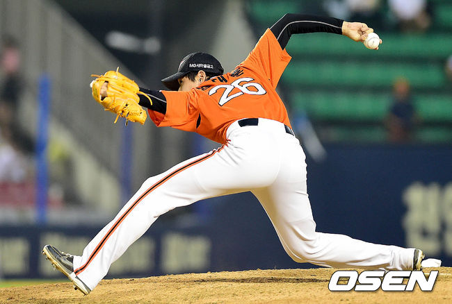 4회말 두산 공격 무사 만루 상황 선발 타투스코에 이어 마운드에 오른 한화 투수 정대훈이 힘차게 공을 뿌리고 있다.
