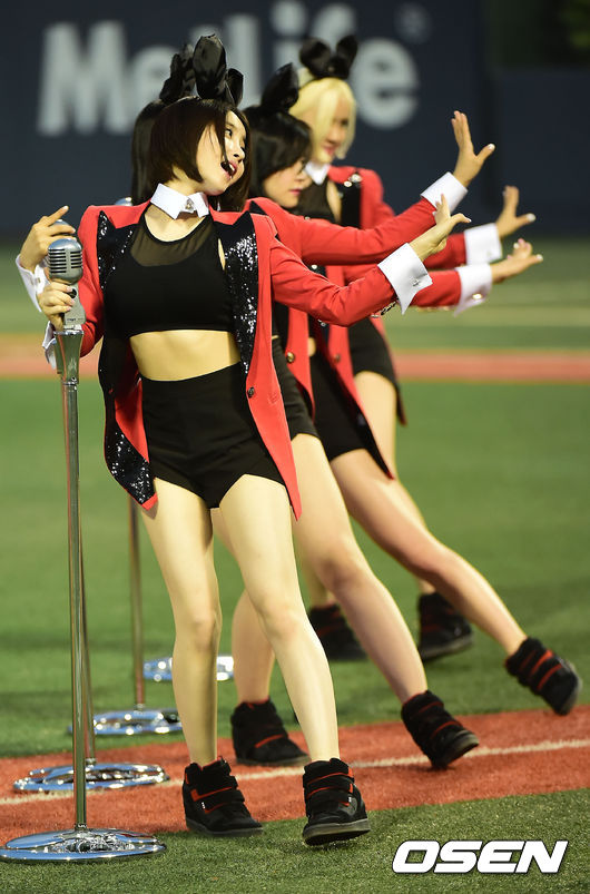 11일 오후 서울 목동야구장에서 열린 '2014 한국야쿠르트 세븐 프로야구' 넥센 히어로즈와 NC 다이노스의 경기, 클리닝 타임에 걸그룹 '단발머리'가 화려한 공연을 펼치고 있다.