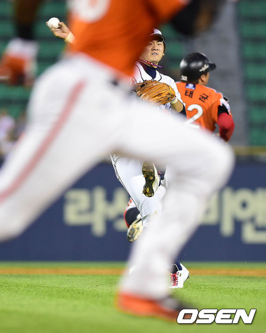5회초 한화 공격 1사 1루 상황 피에의 내야 땅볼 때 두산 2루수 최주환이 주자 김태균을 태그아웃 시킨 뒤 1루로 공을 뿌리고 있다. 타자주자는 세이프.