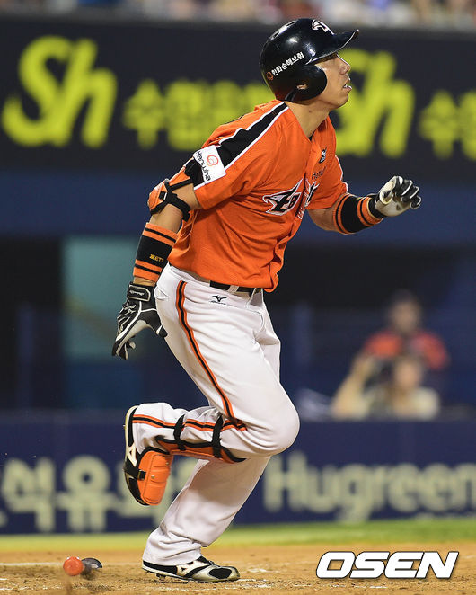 5회초 한화 공격 2사 1루 상황 고동진이 1타점 우중간 2루타를 날리고 있다.