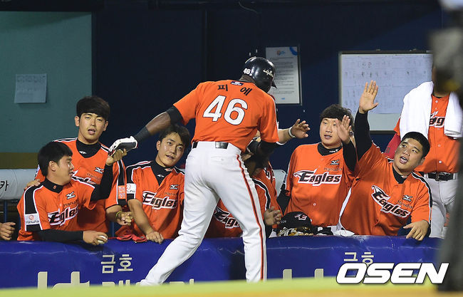 5회초 한화 공격 2사 1루 상황 고동진의 1타점 우중간 2루타 때 홈을 밟은 피에가 더그아웃 동료들과 인사를 나누고 있다.