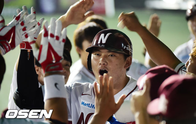 11일 오후 서울 목동야구장에서 열린 '2014 한국야쿠르트 세븐 프로야구' 넥센 히어로즈와 NC 다이노스의 경기, 6회말 2사 주자 2,3루 넥센 이성열이 좌월 스리런 홈런을 날린 후 덕아웃에서 동료들과 하이파이브를 하고 있다.