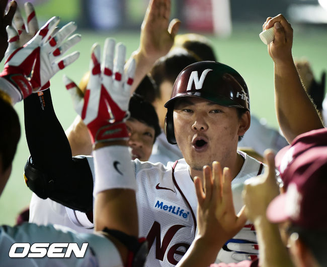 11일 오후 서울 목동야구장에서 열린 '2014 한국야쿠르트 세븐 프로야구' 넥센 히어로즈와 NC 다이노스의 경기, 6회말 2사 주자 2,3루 넥센 이성열이 좌월 스리런 홈런을 날린 후 덕아웃에서 동료들과 하이파이브를 하고 있다.
