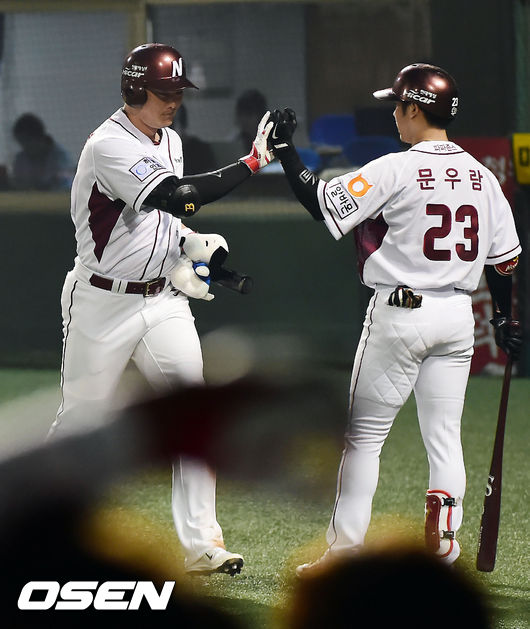 11일 오후 서울 목동야구장에서 열린 '2014 한국야쿠르트 세븐 프로야구' 넥센 히어로즈와 NC 다이노스의 경기, 6회말 2사 주자 2,3루 넥센 이성열이 좌월 스리런 홈런을 날린 후 홈에서 문우람과 하이파이브를 하고 있다.