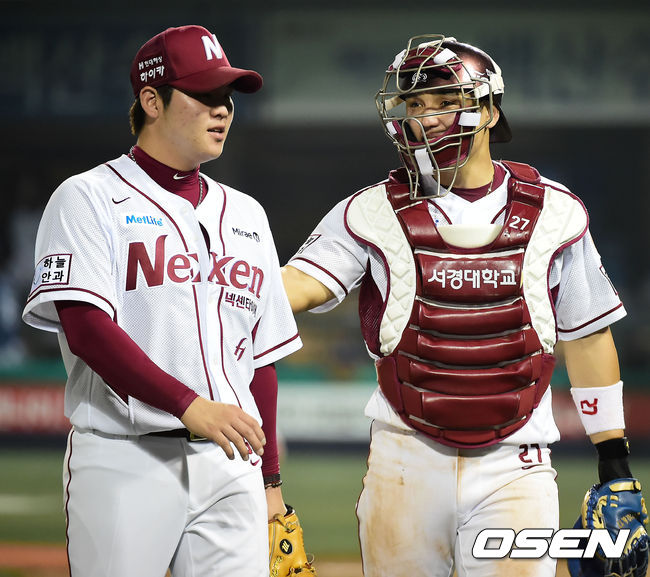 11일 오후 서울 목동야구장에서 열린 '2014 한국야쿠르트 세븐 프로야구' 넥센 히어로즈와 NC 다이노스의 경기, 8회를 마친 넥센 한현희와 박동원이 얘기를 나누고 있다.