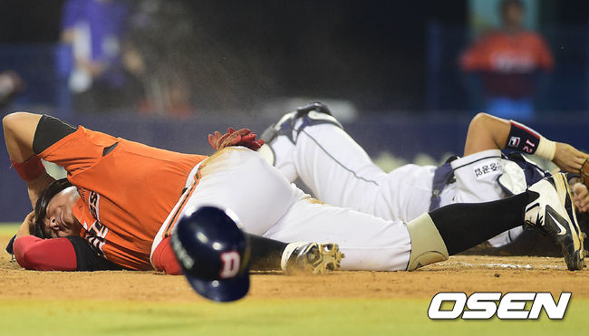 7회초 한화 공격 2사 1, 2루 상황 정범모의 우전 안타 때 2루 주자 김태균이 홈까지 내달려 두산 포수 최재훈과 충돌한 뒤 쓰러져 괴로워하고 있다. 김태균은 세이프 판정.