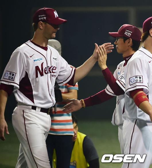 경기를 마치고 밴헤켄과 염경엽 감독이 하이파이브를 하고 있다. / rumi@osen.co.kr