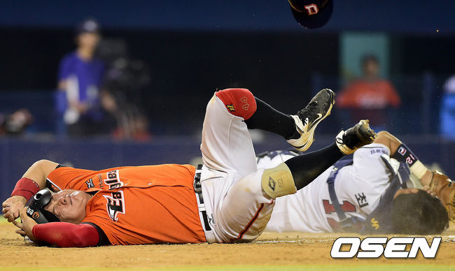 7회초 한화 공격 2사 1, 2루 상황 정범모의 우전 안타 때 2루 주자 김태균이 홈까지 내달려 두산 포수 최재훈과 충돌해 함께 쓰러지고 있다.