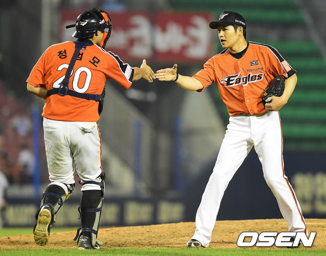 9회 마운드에 올라 삼자범퇴로 경기를 마무리지은 한화 투수 박정진과 포수 정범모가 인사를 나누고 있다./dreamer@osen.co.kr