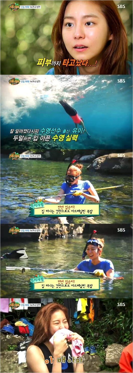 유이는 11일 방송된 SBS 예능프로그램 ‘정글의 법칙’에서 선블록만 발라도 빛나는 피부를 자랑했다. 이어 그는 수영 선수 출신으로서 바다 수영에서도 탁월한 능력을 보여줬다.
