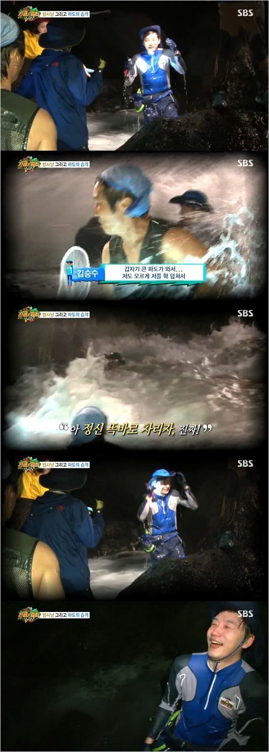 김병만의 분투에 김승수도 바다에 들어갔다. 그런데 갑자기 파도가 밀려왔고 김승수는 중심을 잃고 물에 빠졌다. 김승수는 제작진과의 인터뷰에서 “순간 당황했다. 정신 똑바로 차리지 않으면 안 되겠다 싶었다. 웃었지만 크게 당황했었다”고 고백했다.