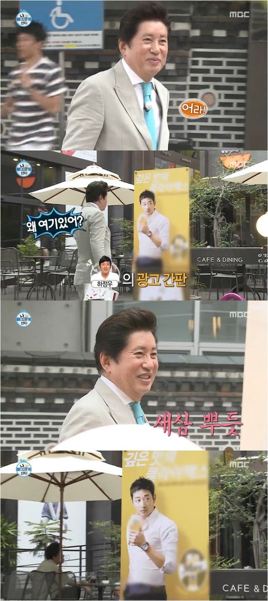 배우 김용건이 아들 하정우의 입간판을 발견하고 흐뭇한 미소를 지었다.