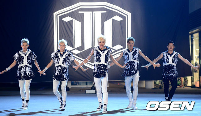 지난 11일 밤 고양시 일산서구 원마운트 야외 공연장에서 열린 JJCC의 '빙빙빙' 뮤직비디오 촬영 현장 공개에서 JJCC 멤버들이 안무를 리허설 하고 있다.