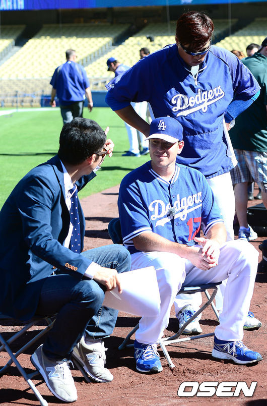 12일(한국시간) 미국 캘리포니아주 로스앤젤레스 다저스타디움에서 열리는 '2014 메이저리그' LA 다저스와 샌디에이고 파드리스와의 경기에 앞서 MBC 스포츠 플러스 손혁 해설위원이 경기장을 찾아 A.J 엘리스의 인터뷰를 하던중 류현진이 다가와 인터뷰를 듣고 있다.